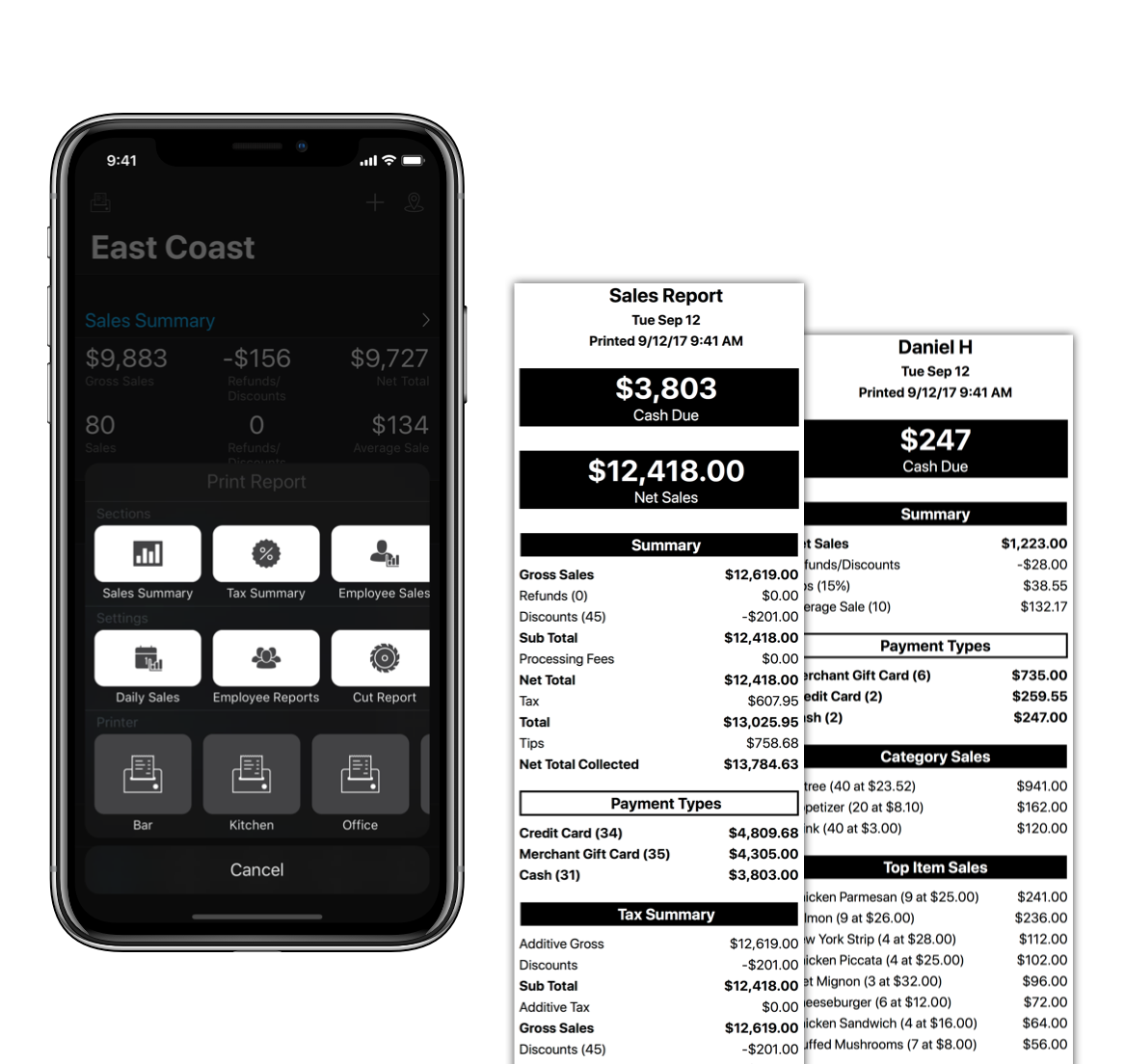 Easily print customizable reports for each employee for quicker end-of-day closing.