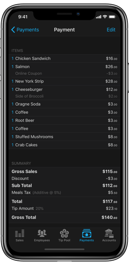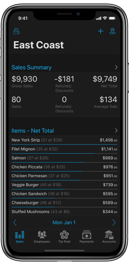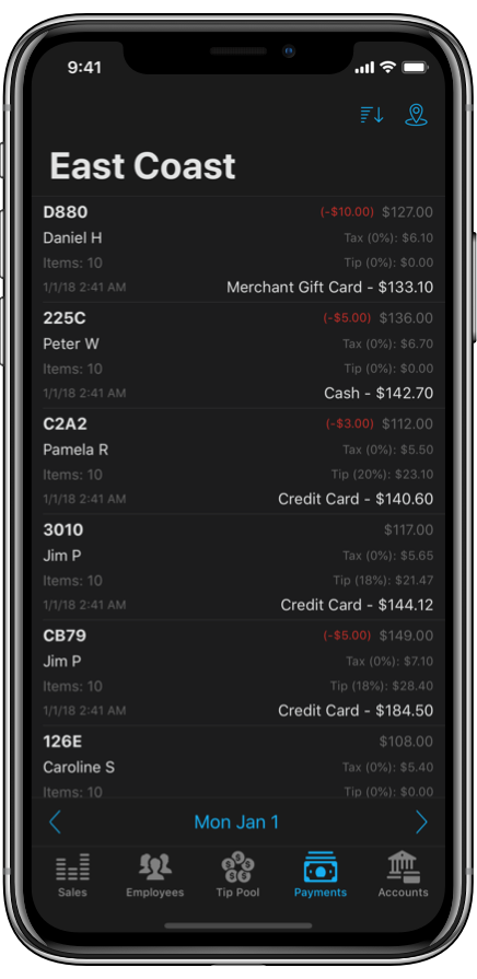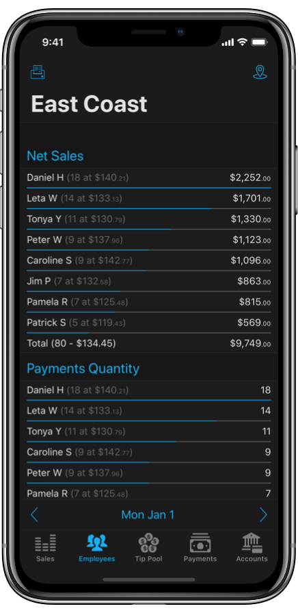 View detailed employee reports to compare and log employee sales and tips.