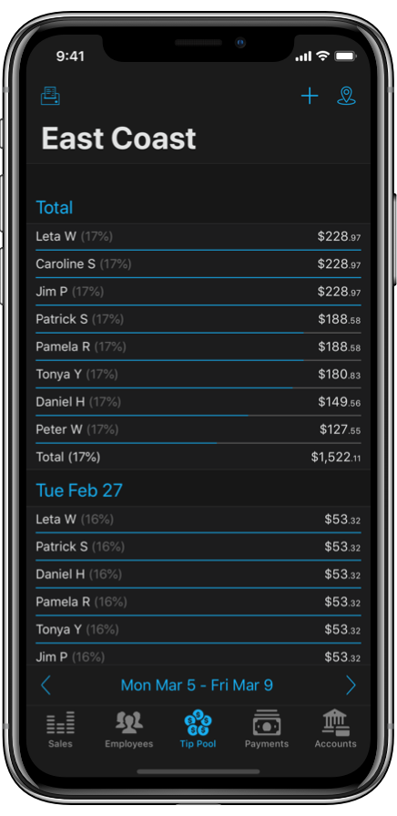 Calculate tip pools over any period with optional tip outs and exclusions from the tip pool.